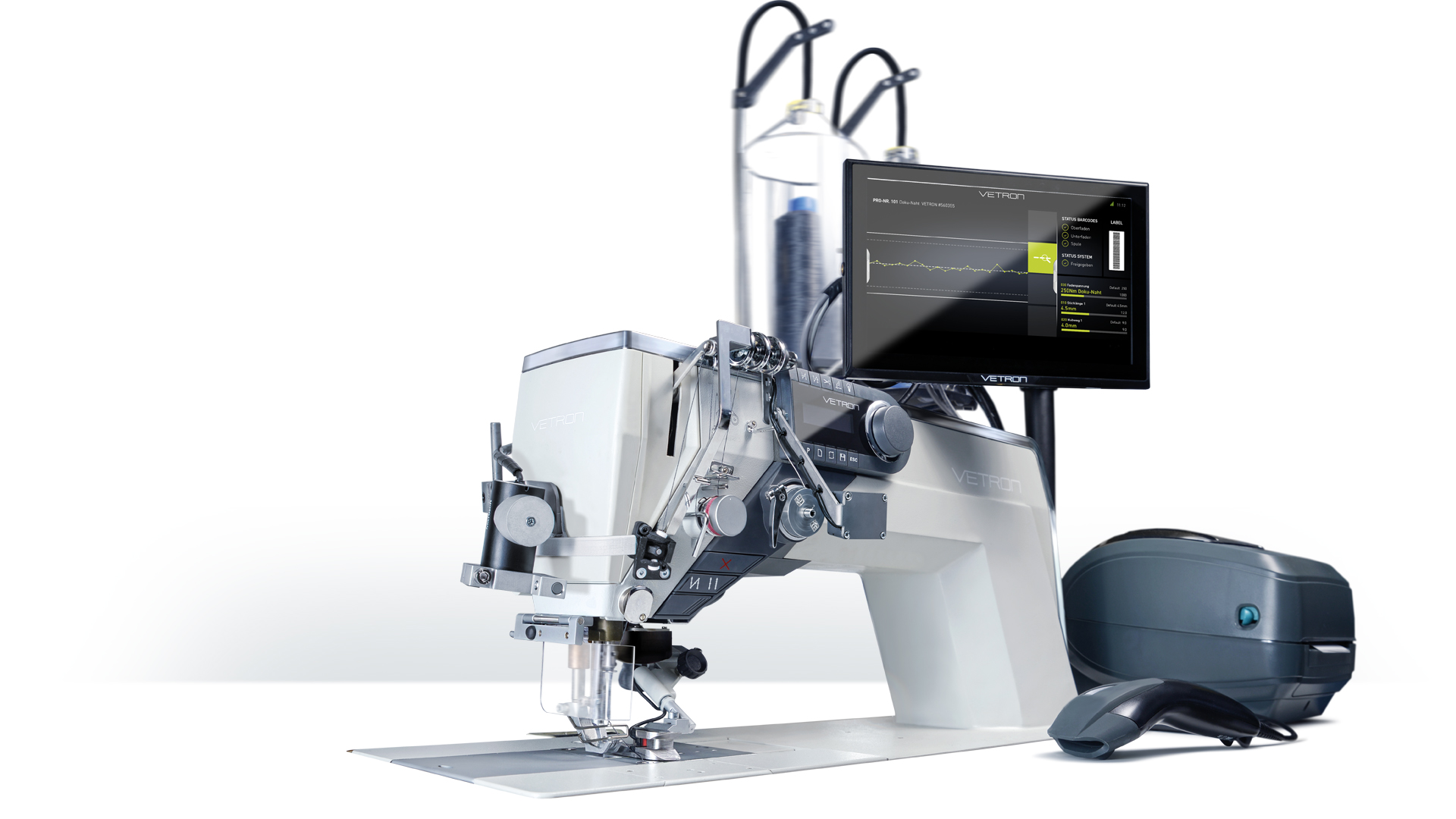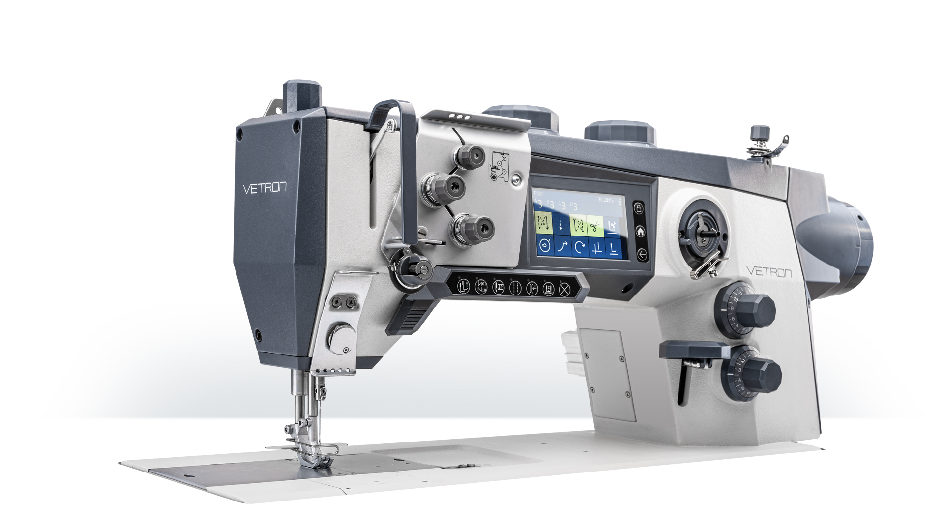 Ausgestattet mit einem Fadenabschneider, Fadenklemme für einen sauberen Nahtanfang, elektrisch zuschaltbarer Zusatz-Spannung, zweiter Stichlänge und Obertransporthub, Tastenleiste für den Schnellzugriff auf Funktionen, eingebauter LED-Nähleuchte und einem integrierten modernen Touch-Bedienfeld im Maschinenarm, bietet die VETRON 4000 Serie alle Features einer modernen, klassischen Industrienähmaschine.